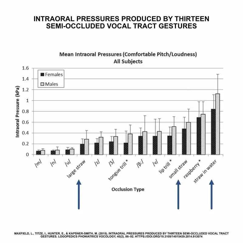 In a study by Maxfield et al (2014), intraoral pressures were explored across 13 different SOVT tasks. The aim was to compare these SOVT gestures, which in turn might inform how user might select a particular SOVT gesture to suit. The table to the left shows the mean intraoral pressures associated with these 13 gestures, when performed on a comfortable pitch/loudness. The most important take-away points are: