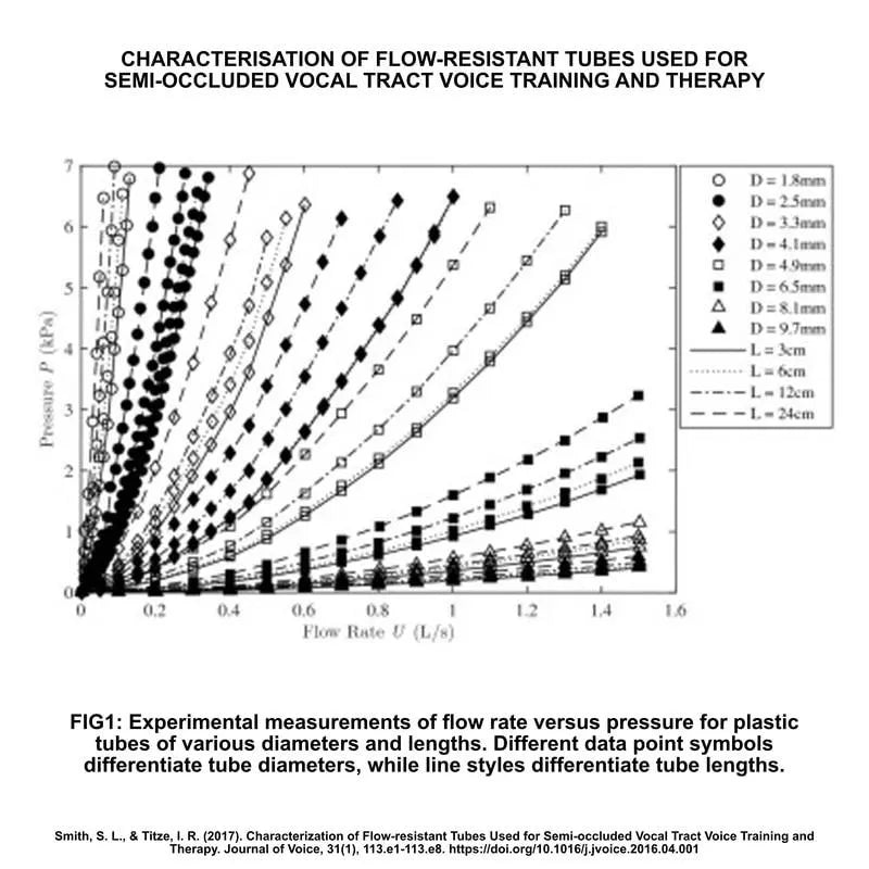 Further complimenting this, Smith and Titze, in a 2017 study, explored the categorisation of flow-resistant tubes used for SOVT training and therapy. Their work identified that a reduction in the diameter of a tube by half (5mm to 2.5mm) will increase the resistance factor between 4-10 times, depending on the length of the tube and the airflow rate. Additionally, Smith & Titze state that an increase in the length of the tube will also increase the resistance.