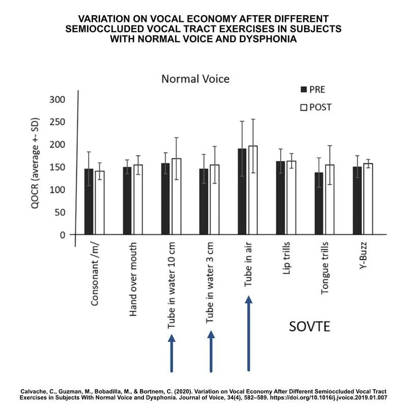 Calvache et al. found that there were improvements in vocal economy across all straw configurations - lending support to our SOVT Straw design, with the 5mm straw submerged in 100mm of water coming out on top as the most efficacious for promoting vocal efficiency. This is another reason why we designed our SOVT Straw to be variable in resistance, as you can always choose your preferred "value" no matter if you're training with/without water.